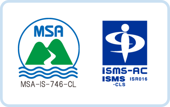 お客様に安心してご利用いただくため、情報セキュリティマネジメントシステム(ISMS)の国際規格であるJIS Q 27001(ISO/IEC 27001)およびJIS Q 27017(ISO/IEC 27017)を取得しています。データは日本国内に保存しており、さらに遠隔地にバックアップデータセンターを設置し、大規模震災等が発生してもサービスを継続できるよう備えています。